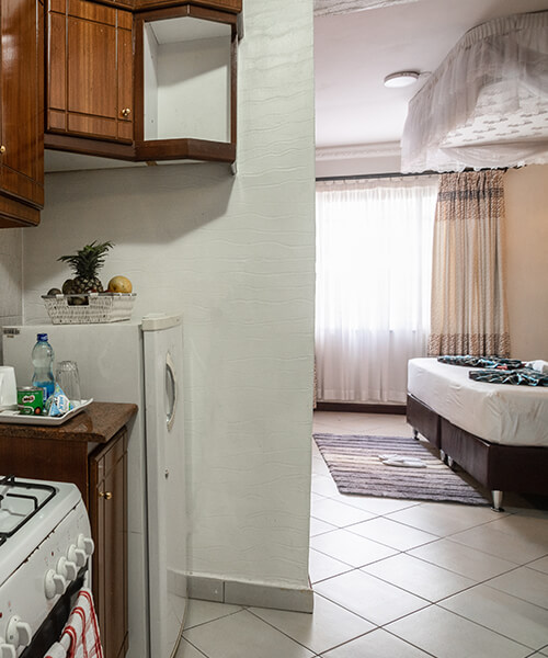 Our Studio Room boasts a spacious, all-in-one design ideal for extended stays, families, or anyone seeking extra room and convenience. With an integrated sleeping, living, and work area in one open space, it offers a comfortable and functional atmosphere that makes you feel right at home. Open-concept layout featuring a bed, lounge area, and kitchenette.