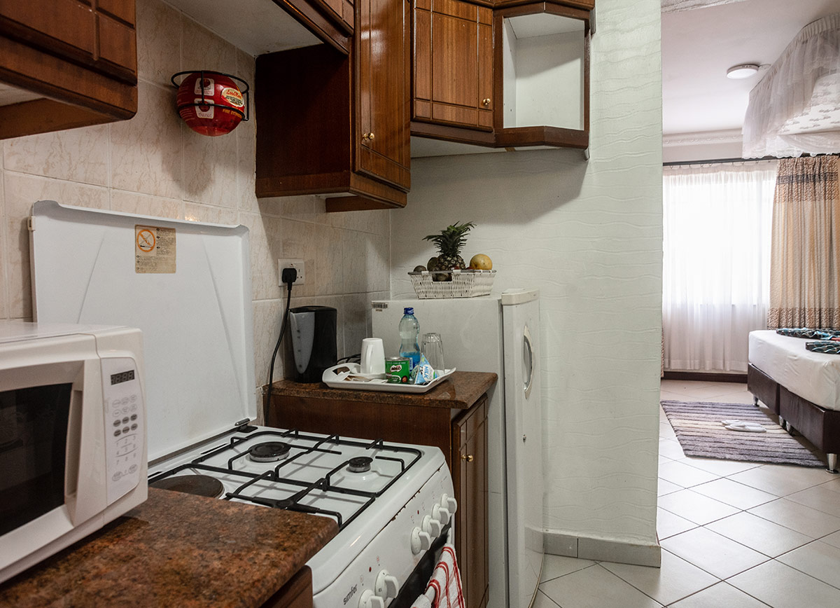 Kitchenette with Microwave, Fridge, Kettle, and Cutlery